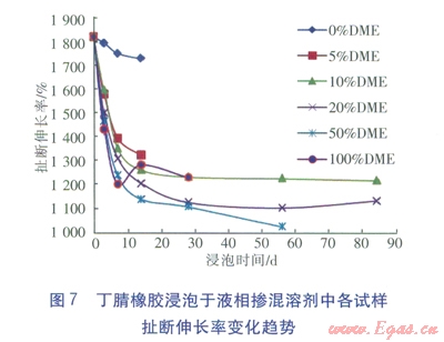 ①液相摻混溶劑對丁腈橡膠的拉伸扯斷強度影響較大,對扯斷伸長率有一定影響;總體趨勢為在開始的10d內(nèi)拉伸扯斷強度降低,扯斷伸長率變