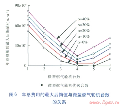本文將考慮設(shè)備容量離散性的優(yōu)化配置方法與最小最大后悔值法相結(jié)合,發(fā)展了考慮負荷不確定性的魯棒優(yōu)化配置方法。其實質(zhì)就是在初投資最少與年運行能耗費用最小之間找到平衡點,使得兩者之和(即評價經(jīng)濟性最優(yōu)的年總費用指標)受負荷不確定性的影響最小化。這樣,既避免了按單一的最大或最小負荷配置系統(tǒng)時出現(xiàn)設(shè)備容量偏大或偏小的問題,降低了負荷不確定性給系統(tǒng)的優(yōu)化配置方案在實際運行時帶來的經(jīng)濟風險,保證了經(jīng)濟效益能得到充分發(fā)揮,又使得優(yōu)化的設(shè)備容量與市場上現(xiàn)有設(shè)備的容量一致,避免了采用連續(xù)變量時因按照優(yōu)化容量就近選擇設(shè)備容量而出現(xiàn)經(jīng)濟效益偏離最優(yōu)點的情況。此方法可為分布式能源系統(tǒng)的合理配置提供參考。