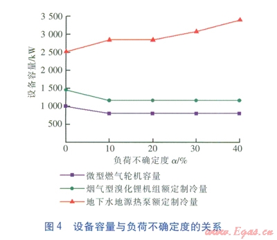 在上述5種工況的優(yōu)化配置方案中,各種設(shè)備的優(yōu)化容量與負荷不確定度的具體關(guān)系見圖4,其中,溴化鋰機組和熱泵機組僅給出了額定制冷量。由圖4可以看出,隨著負荷不確定度a的增加,地下水地源熱泵機組的額定制冷量因考慮極限工況而逐漸增大,而微型燃氣輪機發(fā)電機組和煙氣型溴化鋰機組的容量在考慮負荷不確定性后反而有所減小。這是因為魯棒優(yōu)化配置避免了在負荷需求偏小時出現(xiàn)由于所有設(shè)備容量均增大而引起的年總費用后悔值增大的情況,從而降低了系統(tǒng)的優(yōu)化配置方案在實際運行時的經(jīng)濟風險,使其更具經(jīng)濟魯棒性。
