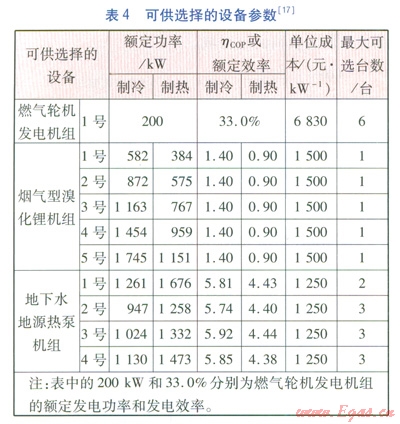 系統(tǒng)可供選擇的設(shè)備參數(shù)見表4。在計算中,貸款年利率取5.94%,設(shè)備的使用年限統(tǒng)一取l5a。分時電價為:10:00~15:00、18:00~21:00為峰段,電價l.0125元/(kW·h);23:00~7:00為谷段,電價0.3535元(kW·h);7:00—10:00、15:00~18:00、21:00~23:00為平段,電價0.6725元/(kW·h)。氣價取l.85元/m3,天然氣低熱值取35.2 MJ/m3。燃氣輪機模型中的系數(shù)取值見文獻