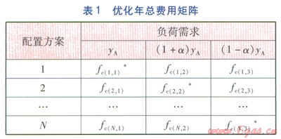 表1是由各種配置方案在3種不同負荷需求下優(yōu)化得到的年總費用所構(gòu)成的矩陣。“*”表示在某種負荷需求下,該方案的年總費用最小。