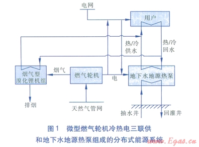 將微型燃氣輪機冷熱電三聯(lián)供與性能系數(shù)高、部分負荷性能好的地下水地源熱泵相結(jié)合,可降低CCHP系統(tǒng)的電熱產(chǎn)出比,緩解其所發(fā)多余電力不能上網(wǎng)的約束,提高系統(tǒng)運行靈活性;相對于單獨的地下水地源熱泵系統(tǒng),地下抽水量少(受水資源量限制小)。