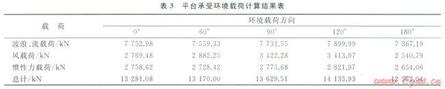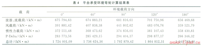 表3、4分別為平臺在該海域所受到各方向環(huán)境載荷、彎矩計(jì)算結(jié)果。