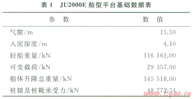 以現(xiàn)今主流的400Ft自升式JU2000E船型為基礎(chǔ)建立等效有限元模型,選取我國東海黃巖海域?yàn)槟M環(huán)境海區(qū),平臺自身性能參數(shù)如表l所示,海區(qū)環(huán)境參數(shù)基本數(shù)據(jù)如表2所示。