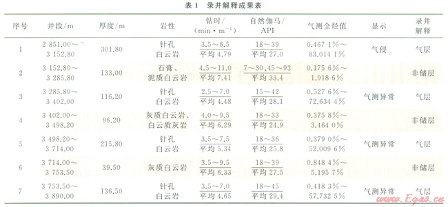 綜合前面的分析以及該井的實(shí)鉆情況,以巖屑、鉆時、氣測、伽馬作為錄井隨鉆評價的主要參數(shù),即通過對碳酸鹽巖分析結(jié)果、巖屑顯微觀察以及隨鉆伽馬曲線的綜合分析,準(zhǔn)確識別出正鉆地層巖性。再利用建立的儲層鉆時、氣測判別標(biāo)準(zhǔn),對儲層進(jìn)行識別和劃分(圖5、表l),結(jié)果如下。