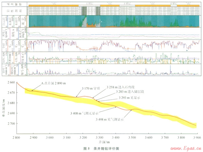 摘 要:四川盆地廣泛分布著低孔隙度、低滲透率的碳酸鹽巖薄儲層,采用水平井鉆井工藝能最大限度地揭示儲層、提高單井產(chǎn)能,但如何才能主導(dǎo)水平井軌跡在薄儲層中鉆進(jìn)卻一直是地質(zhì)導(dǎo)向工作的難點(diǎn)。在川渝地區(qū)第一口地質(zhì)導(dǎo)向井(M-24井,其目標(biāo)儲層為中三疊統(tǒng)雷口坡組T2l11針孔狀白云巖段)的鉆進(jìn)過程中,鑒于隨鉆測井僅能提供隨鉆伽馬數(shù)據(jù),儲層的判別須以錄井參數(shù)為主導(dǎo),而目前錄井儲層評價方法欠缺,故有必要對此開展研究。首先對能作為儲層有效判別依據(jù)的錄井參數(shù)進(jìn)行了綜合研究,優(yōu)選出巖屑、鉆時、氣測值、自然伽馬等參數(shù)作為儲層有效判別的依據(jù);在準(zhǔn)確識別出正鉆地層巖性的基礎(chǔ)上,結(jié)合實(shí)鉆資料(鉆時和氣測值),進(jìn)一步對儲層進(jìn)行識別與劃分,并在隨鉆評價過程中,及時利用錄井解釋結(jié)果提供導(dǎo)向決策,引導(dǎo)水平井在儲層中鉆進(jìn)。最后,將隨鉆錄井評價結(jié)論與鉆后測井解釋結(jié)論進(jìn)行了對比,結(jié)果表明,二者結(jié)論基本一致,僅在儲層段頂?shù)咨疃嚷杂胁町?,證實(shí)了隨鉆錄井評價方法的實(shí)用性和準(zhǔn)確性。