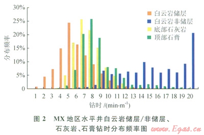 鉆時是儲層判別的重要參數(shù)。根據(jù)區(qū)域水平井資料,對目的層及其圍巖的鉆時進(jìn)行了統(tǒng)計(jì)分析。
