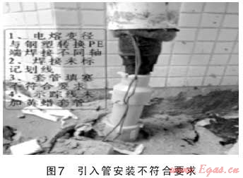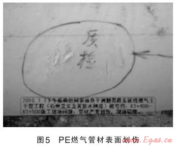 在燃氣管道施工過程中,因施工單位人員、現場監(jiān)理人員以及建設單位現場管理人員對燃氣管道安裝施工質量監(jiān)管不到位,施工經驗不足或者根本不懂燃氣管道施工的重要性,不按照燃氣行業(yè)國家規(guī)范和行業(yè)標準嚴格操作和監(jiān)管,產生一系列施工質量隱患。如鋼管防腐處理不到位、閥井內波紋補償器受外力安裝偏斜或不同軸,電熔管件焊接焊口冷卻采取沖水冷卻方式,PE管道運輸、搬運造成管壁劃傷嚴重超標等人為因素,給城市燃氣管道安全運行種下了一顆顆定時炸彈(如圖3、4、5)。