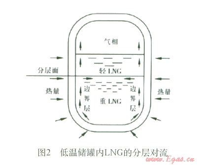 渦旋主要是由于在向盛有LNG的低溫儲罐中充注新的LNG液體或者LNG中氮蒸發(fā)而使儲罐內(nèi)的液體發(fā)生分層。分層液體在儲罐周邊漏熱的作用下,形成各自獨立的自然對流循環(huán),進而使各層液體的密度不斷發(fā)生變化,見圖2。當(dāng)相鄰兩層液體的密度近似相等時,兩個液層就會發(fā)生強烈混合,下層積聚的熱量突然釋放出來,同時伴隨著LNG表面蒸發(fā)率的驟增,幾乎可達到正常情況下蒸發(fā)率的250倍。蒸發(fā)產(chǎn)生的大量氣體,引起儲罐內(nèi)壓力突然增大,導(dǎo)致大量天然氣排空,造成嚴重浪費,甚至可能毀壞儲罐及工藝系統(tǒng),引起爆炸或火災(zāi),嚴重威脅人員和財產(chǎn)安全。