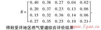 其次,綜合考慮影響管道失效的所有因素進(jìn)行二級(jí)模糊綜合評(píng)判確定管段的風(fēng)險(xiǎn)等級(jí),根據(jù)對(duì)各因素的等級(jí)計(jì)算得出模糊綜合評(píng)價(jià)集合R: