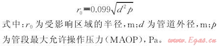 依據(jù)ASME B31.8S-2001[1]標(biāo)準(zhǔn),天然氣管道的影響半徑可按下式計(jì)算: