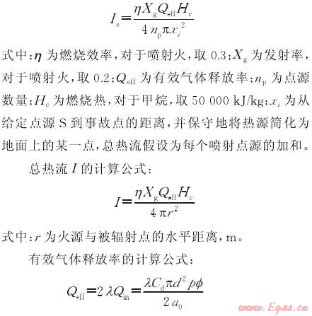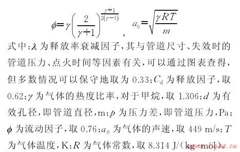 天然氣管道的泄漏事故總體分為兩種。即噴射火和爆炸,以某城市燃?xì)夤艿罏槔?,分別計(jì)算兩種情況下管道的泄漏影響范圍,其中燃燒使用ASME推薦公式計(jì)算,而擴(kuò)散則應(yīng)用高斯模型計(jì)算。相關(guān)參數(shù):管道直徑1m,輸氣壓力分別為3.5MPa和4.0MPa,假設(shè)事故原因?yàn)榈谌狡茐?,后果是出現(xiàn)15cm孔洞。
