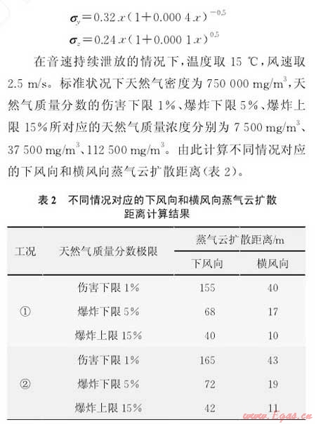 基于管道內(nèi)部參數(shù)相關(guān)的壓力、泄漏面積、泄漏口形狀、管道內(nèi)部質(zhì)量(氣源狀況),以及管道外部參數(shù)相關(guān)的地面風(fēng)速、大氣穩(wěn)定度、地面狀況等,假設(shè)泄漏為穩(wěn)態(tài)小孔泄漏,對(duì)天然氣管道泄漏影響區(qū)域進(jìn)行計(jì)算,得出如下結(jié)論: