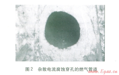 雜散電流腐蝕穿孔速度快,影響范圍廣,且隨機性強。雜散電流腐蝕創(chuàng)面光滑,邊緣較整齊,產(chǎn)生黑色腐蝕產(chǎn)物。修復方式同細菌腐蝕,但應注意多數(shù)雜散電流腐蝕并不單一出現(xiàn)。圖2為某搶修現(xiàn)場雜散電流腐蝕穿孔的燃氣管道。