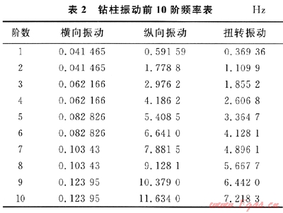 文中對鉆柱的振動(dòng)模態(tài)分析擴(kuò)展到20階模態(tài),但是根據(jù)大量研究試驗(yàn)可知,10階模態(tài)就足以表明鉆柱的振動(dòng)情況。表2列出了鉆柱橫向、縱向、扭轉(zhuǎn)振動(dòng)的前10階頻率。