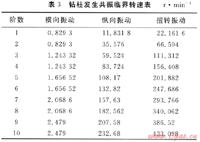 將表2中鉆柱振動(dòng)的固有頻率計(jì)算結(jié)果分別代入上式得到鉆柱共振不同階數(shù)的臨界轉(zhuǎn)速,如表3所示。