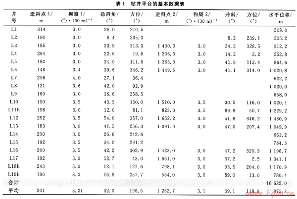 BH36油氣田經(jīng)過(guò)10多年的開發(fā)[1],已經(jīng)形成了一套海上叢式井鉆井技術(shù)體系[2~3]且逐漸步入開發(fā)的中后期,為有效提高剩余油氣的動(dòng)用程度,提高采收率,通過(guò)實(shí)施細(xì)致的油氣藏工程分析,決定在原來(lái)350m×350m的開發(fā)井網(wǎng)中實(shí)施排狀加密。井口間距2.0m×2.0m,每個(gè)鉆井平臺(tái)總井?dāng)?shù)為16口,控制含油氣面積大約2km2,該油氣田垂深平均為1600m,平均井深在2000m左右。不難看出,在原井網(wǎng)中鉆再加密井網(wǎng)進(jìn)行調(diào)整是海上油氣田開發(fā)所面臨的新課題。該區(qū)的井身結(jié)構(gòu)如圖1所示,平臺(tái)的基本數(shù)據(jù)如表1所示。