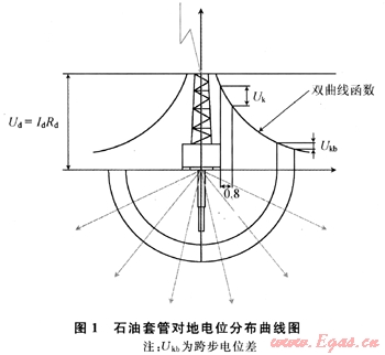 井架和石油套管遠(yuǎn)遠(yuǎn)超出常規(guī)的接地體尺寸,因此一般認(rèn)為石油鉆機井架就是最好的巨型避雷針,石油套管就是最好的巨型接地體。當(dāng)鉆臺上工頻下某相絕緣破壞或設(shè)備外殼帶電時,觸摸帶電設(shè)備外殼時的接觸電位為Ud,身體站立處的電位為U1: