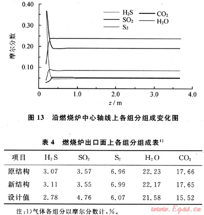 圖13為沿燃燒爐軸線方向各組分組成變化圖。由硫生成曲線來看,單質(zhì)硫在燃燒器內(nèi)增量最快,之后呈非常緩慢的增長趨勢。表4為改進前后燃燒爐出口面上各組分的組成表,由表4可知,出口處各組分含量與燃燒爐實際運行值較為吻合,而與原結(jié)構(gòu)相比,新結(jié)構(gòu)出口面上S2的摩爾分?jǐn)?shù)提高了0.03%,說明采用外環(huán)酸氣入口提高了爐內(nèi)氣體混合效果并進而提高了燃燒爐的總硫轉(zhuǎn)化率。