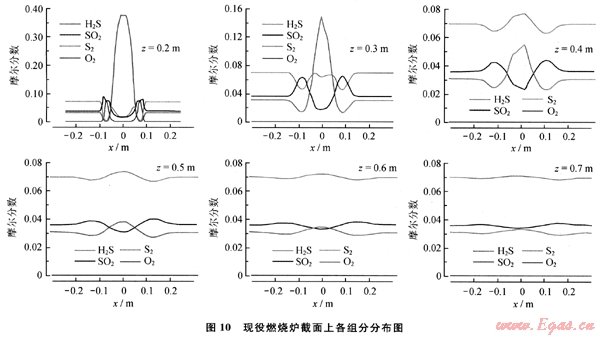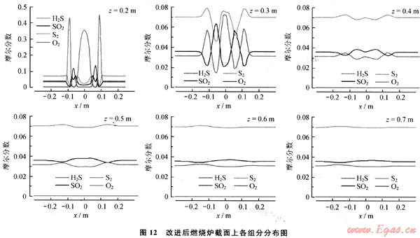 圖12為各組分在噴嘴前端沿xy截面中心軸線上的分布情況。對比圖10可知,H2S由原來的單駝峰式分布變?yōu)槎喾迨椒植?。通過外環(huán)酸氣分流,提高了射流外圍處H2S的含量,外環(huán)酸氣直接通入到原S02濃度最大處,使此處的單質(zhì)硫生成量增多。由各組分濃度變化來看,H2S和S02的二次混合過程由原來主射流旋流擴散混合轉(zhuǎn)變?yōu)橹苯釉谏淞魍鈬吔鐚犹幓旌?。由圖12可知,爐內(nèi)組分在z為0.6m處即可基本達到平衡,說明采用外環(huán)酸氣入口將H2S直接通入S02濃度最大處,提高了H2S與S02的混合效果。