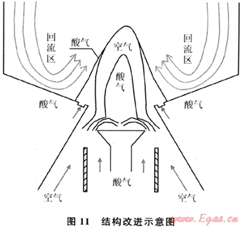 主射流呈一種空氣包絡(luò)酸氣的分布形態(tài),此分布將導(dǎo)致O2消耗完畢后,射流中心區(qū)域內(nèi)H2S過量,射流外圍處S02過量。H2S與S02的混合將主要取決于主射流內(nèi)外氣體的不斷擴散完成,此混合過程相對較慢,對單質(zhì)硫的生成來講是不利的。為此,筆者提出了增設(shè)外環(huán)酸氣入口的結(jié)構(gòu)改進措施(圖11),外環(huán)酸氣入口貼近空氣室外壁面,入口方向與預(yù)混合段平行。通過此方法進行改進,可對射流中心處過量的H2S分流,并將其直接通入到射流外圍的S02濃度最大處。