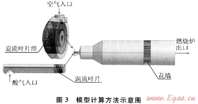 因為燃燒器內(nèi)具有旋流葉片,而且燃燒爐體積龐大又涉及燃燒反應(yīng),因此本次模擬對網(wǎng)格精度要求較高。鑒于此,筆者將燃燒爐分為空氣室、酸氣入口管及燃燒爐爐體3部分分別進行計算,計算示意圖如圖3所示,空氣室和酸氣入口管內(nèi)不涉及組分燃燒,此區(qū)域內(nèi)僅進行流場計算,而且單獨計算時出口截面邊界條件誤差微小,對兩出口截面上速度大小和方向的整體性影響不大。計算完成后利用profile功能將上述兩結(jié)構(gòu)的出口參數(shù)導(dǎo)出,作為燃燒爐爐體的空氣及酸氣入口條件。采用此方法對燃燒爐結(jié)構(gòu)進行模擬,可以大大減少網(wǎng)格數(shù)量,節(jié)省計算時間,并且提高計算精度。