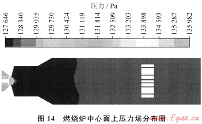 圖14為新結(jié)構(gòu)下燃燒爐內(nèi)的壓力分布圖。從圖14可以看出,壓降損失最大的區(qū)域為噴嘴至火焰區(qū)的收斂噴口處,火焰區(qū)內(nèi)處于負(fù)壓,出口處壓強約128kPa,入口處壓強最高為136kPa。爐內(nèi)總壓降為8kPa,與忠縣天然氣凈化廠內(nèi)燃燒爐設(shè)計壓降11kPa相比,減小了3kPa。因此新結(jié)構(gòu)在滿足現(xiàn)有硫回收功能的同時,能夠減小設(shè)備壓降,提高總硫回收率。