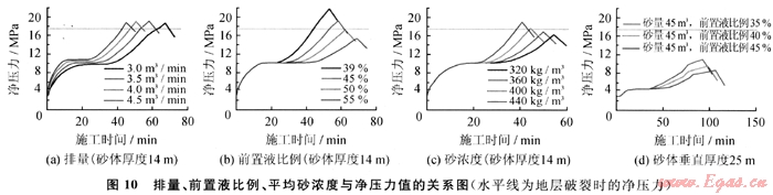 從圖10可以得出排量和平均砂濃度沒有前置液比例對縫內(nèi)凈壓力上漲的控制力度大,且25m垂直厚度的厚儲層凈壓力漲幅遠(yuǎn)低于14m的薄儲層凈壓力的漲幅。按照凈壓力預(yù)測結(jié)果,以增加主裂縫縫長和控制次生裂縫產(chǎn)生為出發(fā)點,蘇5、桃7區(qū)塊水平井分段壓裂參數(shù)優(yōu)化范圍如下:排量3.5~4.0m3/min、薄砂體前置液比例45%~50%,厚砂體前置液比例43%~45%,平均砂濃度360~400kg/m3。