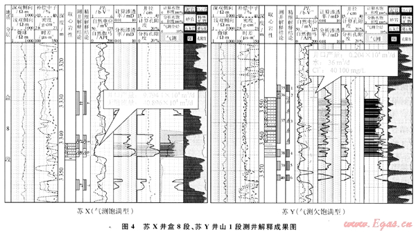 蘇X井盒8段(圖4),峰形飽滿,全烴顯示厚度比儲層厚度大,氣測解釋為氣層,電測解釋氣層,綜合分析解釋為氣層,試氣獲無阻流量9.7914×104m3/d的工業(yè)氣流。蘇Y井山1段(圖4),全烴峰值顯示較低,峰形不飽滿,全烴顯示厚度小于儲層厚度,氣測解釋為氣水同層,電測解釋為差氣層,綜合分析為氣水同層。經(jīng)測試井口產(chǎn)量0.035 4×104m3/d,水36m3/d,驗證了利用聲波時差 電阻率圖版法與氣測綜合分析判斷識別氣水層的準(zhǔn)確性。