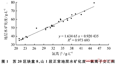 蘇20區(qū)塊盒8、山1段的地層水中氯離子含量在20320~49060mg/L,占陰離子總量的98%以上。地層水礦化度與Cl-含量交會圖(圖1)中的交會線對應(yīng)性很好,表明地層水中的Cl-嚴(yán)格控制總離子量,氯離子和礦化度幾乎同步等速變化。