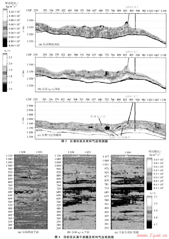 從反演結果(圖3-a,圖3-b,圖4-a,圖4-b)以及井曲線的敏感屬性分析可以得到,syb1井在目的層段的多種屬性基本上表現(xiàn)出不是良好的儲氣層段,而 syb1c1井的井底位置恰好在多種屬性分析上都表現(xiàn)出是良好的儲氣層段。這也直接驗證了syb1井是低產井,而syb1c1井是一個高產氣井的客觀事實。對于本區(qū)含氣儲層段,橫波阻抗和vp/vs屬性是檢測氣藏非常好的2個參數(shù),因此,選擇橫波阻抗和vp/vs屬性體進行有利氣層預測。圖3-c和圖4-c是有利氣層預測的過井剖面圖及目的層平面上有利氣層預測圖。