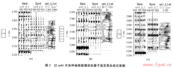 對于近道、中道和遠道數(shù)據(jù)體分別提取了子波,經過多次子波估算,最后得到了比較理想的子波以及由估算的子波制作的合成記錄。圖2-a是過syb1井的近道數(shù)據(jù)的估算子波及其合成記錄,圖2-b是過syb1井的中道數(shù)據(jù)的估算子波及其合成記錄,圖2-c是過 syb1井的遠道數(shù)據(jù)的估算子波及其合成記錄。
