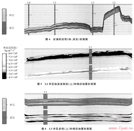 對比圖1~4,可以看出疊前隨機反演結(jié)果的垂直分辨率較疊前AVA同步反演結(jié)果有很大提高,地震資料無法分辨的L2井區(qū)的兩套薄砂層(圖5)和L3井區(qū)的砂泥互層(圖6)在反演結(jié)果中均表現(xiàn)十分清楚。該氣組儲層是低水位期在內(nèi)陸架環(huán)境中形成的近源風(fēng)暴席狀沙沉積,分布較穩(wěn)定。而反演結(jié)果中儲層橫向連續(xù)性也很好,符合該區(qū)的沉積相分布特征;同時上下層位的接觸關(guān)系與原始地震資料也吻合很好,進(jìn)一步驗證了預(yù)測的可靠性。反演成果在該氣田的開發(fā)井設(shè)計優(yōu)化中得到了實際應(yīng)用,并為今后的氣田開發(fā)實施提供了有力的資料,有利于降低開發(fā)風(fēng)險、提高效率。
