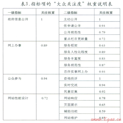 2)社會各階層很少注意的項目,例如監(jiān)督管理、在線受理、專題欄目等,雖然也十分重要,但其權(quán)重應(yīng)該與其他重點指標(biāo)有差距,才能體現(xiàn)評估的公正性;