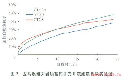 水相圈閉是制約致密砂巖氣井產(chǎn)能的重要因素,毛細(xì)管自吸和液相滯留則是產(chǎn)生水相圈閉的主要原因[19]。與致密砂巖儲(chǔ)層相比,貞巖儲(chǔ)層具有更為發(fā)育的微裂縫系統(tǒng),更高的毛細(xì)管力。并且由于頁巖富含有機(jī)質(zhì)等性質(zhì),巖石也具有明顯親油性質(zhì)(表6)。多種因素的共同作用,使得頁巖對(duì)油相具有顯著的自吸及滯留作用[20-22]。油基鉆井完井液濾液的自吸實(shí)驗(yàn)表明,干巖樣的自吸飽和度為38%~48%(圖2)。油相飽和度大幅度增加,大量濾液吸附滯留在孔道之中而難以返排,勢(shì)必導(dǎo)致氣相滲透率降低,產(chǎn)生油相圈閉損害。