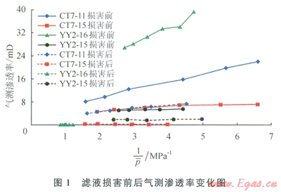 靜態(tài)損害實(shí)驗(yàn)的濾液為TGl6-WS高速離心機(jī)將原漿在6000r/rain下離心分離固相并過濾后得到。實(shí)驗(yàn)通過巖樣在濾液損害前(Kf1)與損害后(Kf2)的克氏滲透率變化,評(píng)價(jià)損害程度,具體實(shí)驗(yàn)步驟請(qǐng)參閱本文參考文獻(xiàn)[8]。