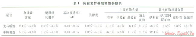 實(shí)驗(yàn)巖樣為四川盆地龍馬溪組和牛蹄塘組頁巖,基礎(chǔ)物性參數(shù)見表l。該2組地層均是古生代海相沉積形成的富有機(jī)質(zhì)頁巖,后期經(jīng)歷了大幅度的構(gòu)造抬升和強(qiáng)烈的地質(zhì)改造作用[3]。地層硬脆性特征明顯,微裂縫發(fā)育,常見于石英、長石等骨架顆粒間以及云母片中。裂縫面溶蝕作用明顯,常見黏土礦物呈片狀、絮狀充填以及方解石充填。