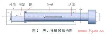 液力推進器連接在下部鉆具內(nèi)。它是一個液缸活塞短節(jié)。圖2為液力推進器結(jié)構(gòu)岡例。依靠液缸內(nèi)的液體壓力推動活塞運動,實現(xiàn)給鉆頭加壓。依靠外筒上的導槽與活塞端部的鍵來傳遞扭矩。