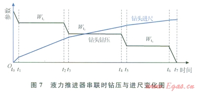 4)可以通過多個液力推進器的串聯(lián),實現(xiàn)增加推進行程和多鉆壓或選鉆壓鉆進。圖7為3個液力推進器串聯(lián)使用的鉆壓和進尺變化圖。在當前鉆井液排量、鉆頭噴嘴組合和下部鉆具組合的條件下,3個推進器的工作鉆壓分別為Wt1、Wt2和Wt3。當在t0時刻將鉆壓加滿額時,3個推進器都處在全縮進狀態(tài),依靠鉆柱彈性鉆進至t1時刻;在t1至t2時刻,第1個推進器處于工作狀態(tài),其余2個處于全縮進狀態(tài);在t3至t4時刻,第l個推進器處于全伸出狀態(tài),其余2個處于全縮進狀態(tài),依靠鉆柱彈性鉆進;在t3至t4時刻,第1個推進器處于全伸出狀態(tài),第2個推進器處于工作狀態(tài),第3個處于全縮進狀態(tài);在t4至t5時刻,第l個和第2個推進器處于全伸出狀態(tài),第3個處于全縮進狀態(tài),依靠鉆柱彈性鉆進;在t5至t6時刻,第l個和第2個推進器處于全伸出狀態(tài),第3個推進器處于工作狀態(tài);在t6至t7時刻,3個推進器都處于全伸出狀態(tài),依靠鉆柱彈性鉆進,直至鉆壓為零。在多個液力推進器串聯(lián)時,可以像圖7那樣讓所有的推進器全部工作,也可以通過控制地面送鉆使其中的部分推進器工作,不工作的推進器處于全伸出狀態(tài)或全縮進狀態(tài)。
