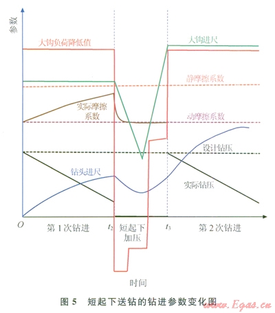 如何克服地面單向送鉆因摩擦力不確定帶來的鉆壓不確定的問題?用短起下送鉆方法(圖5),在鉆頭鉆壓較小時就上提鉆柱,將靜摩擦力克服掉,上提一段后,下放鉆柱,重新按照鉆壓控制參考表施加。這樣就可以減小施加到鉆頭上的鉆壓的誤差。