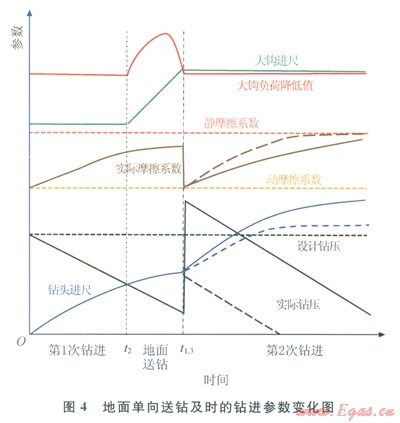 地面單向送鉆是指在鉆進過程中沒有上提鉆具操作,只有下放鉆具和停止的送鉆方式。