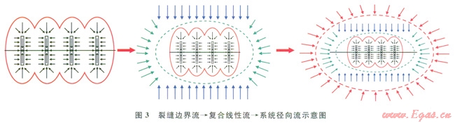 如果頁巖氣井生產(chǎn)時(shí)間夠長,隨著泄流面積的增大,整個(gè)水平井段和裂縫系統(tǒng)就如同l口影響范圍擴(kuò)大了的直井,在距離水平井段和裂縫系統(tǒng)較遠(yuǎn)的儲(chǔ)層內(nèi)就會(huì)出現(xiàn)系統(tǒng)徑向流(圖3)。對(duì)于頁巖氣井l而言,由于滲透率較低,系統(tǒng)徑向流出現(xiàn)的時(shí)間很晚,在頁巖氣井的整個(gè)生命期內(nèi)一般不會(huì)出現(xiàn)系統(tǒng)徑向流[15]。