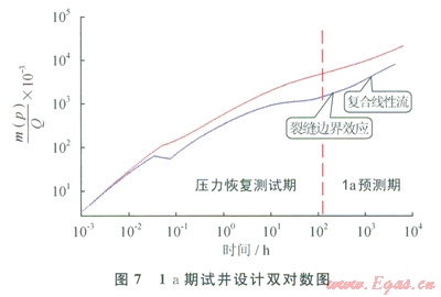 從圖7中的la預(yù)測期可以看出,壓力恢復(fù)測試期過后表現(xiàn)為裂縫邊界流和復(fù)合線性流特征,氣井生產(chǎn)1a仍然沒有出現(xiàn)系統(tǒng)徑向流和外邊界效應(yīng),同時(shí)也驗(yàn)證了測試期出現(xiàn)的線性流和徑向流分別為早期線性流和早期徑向流。