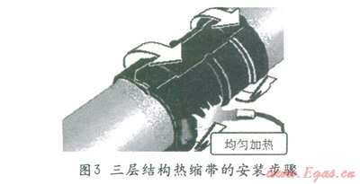 為了滿足設(shè)計(jì)要求,一般深水海管節(jié)點(diǎn)都選用三層結(jié)構(gòu)熱縮帶,這種熱縮帶在鋪管船作業(yè)線上施工主要有以下幾個(gè)關(guān)鍵點(diǎn):