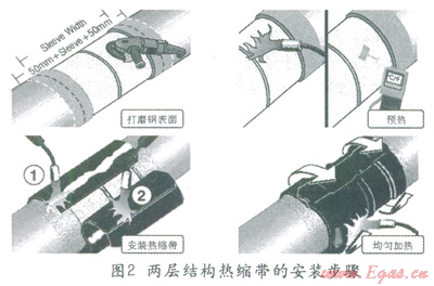 兩層結(jié)構(gòu)熱縮帶施工簡(jiǎn)單,只需要對(duì)海管節(jié)點(diǎn)裸鋼表面進(jìn)行打磨、預(yù)熱就可以安裝熱縮帶了。安裝過程只需要將熱縮帶纏繞在節(jié)點(diǎn)上,按要求均勻加熱,熱縮帶就會(huì)收縮,緊緊的固定在節(jié)點(diǎn)鋼表面上。一般只需要占用鋪管作業(yè)線的一個(gè)站點(diǎn),兩個(gè)人用五分鐘左右就可以完成一個(gè)節(jié)點(diǎn)的防腐施工。