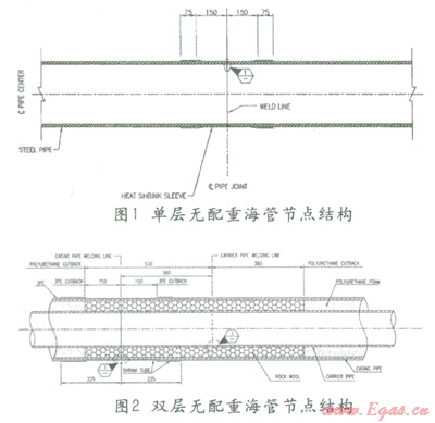 不同結(jié)構(gòu)的海管也有多種不同結(jié)構(gòu)的節(jié)點(diǎn),無配重海管的普通節(jié)點(diǎn)結(jié)構(gòu)如圖l、2所示。此外常見的海管還有單層配重管、單層保溫管、雙層配重管等多種結(jié)構(gòu)。