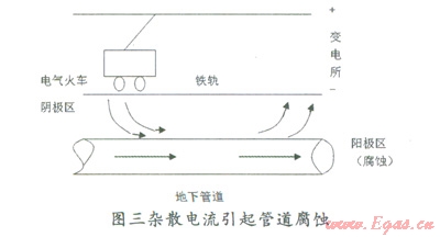 2)雜散電流。所謂雜散電流是指沿規(guī)定回流以外流動(dòng)的電流。雜散電流流出的地方成為腐蝕電池的陽(yáng)極區(qū),腐蝕破壞就發(fā)生在這個(gè)地方,金屬損失量與流過(guò)的雜散電流的電量成正比,符合法拉第定律,即一安培電流流過(guò)一年就相當(dāng)于約九公斤的鐵發(fā)生電化學(xué)腐蝕而溶解掉了,可見(jiàn)雜散電流引起的腐蝕是相當(dāng)嚴(yán)重的。
