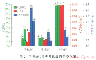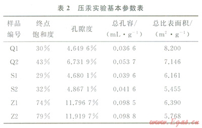 測試儀器為美國麥克爾儀器公司生產(chǎn)的Auto pore Ⅳ9505全自動壓汞儀,工作壓力范圍為0.000689~413.79MPa,孔徑測量范圍為5~360000nm,汞能進(jìn)入的最小半徑為3nm。計算機控點式測量,高壓段選取壓力點36個,每點穩(wěn)定時間2s,樣品測試質(zhì)量3g左右。