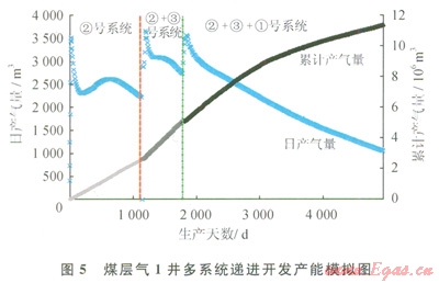 1)多煤層發(fā)育地區(qū)各層序組之間發(fā)育低滲透巖層,往往存在多層疊置獨(dú)立含煤層氣系統(tǒng)。各含氣系統(tǒng)單獨(dú)排采產(chǎn)氣量低,排采時間短,成本高;而多含氣系統(tǒng)遞進(jìn)排采平均氣產(chǎn)能和累計氣產(chǎn)能高、穩(wěn)產(chǎn)期時間長。但多含氣系統(tǒng)在合層排采時,由于各系統(tǒng)壓力不同,系統(tǒng)間存在相互干擾,并非所有含氣系統(tǒng)都有產(chǎn)能貢獻(xiàn)。