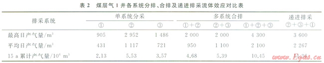 單獨(dú)排采①號系統(tǒng),產(chǎn)氣量介于306~905m3/d,平均為431m3/d(圖2),15a排采的累計產(chǎn)氣量為2.13×106m3(表2);單獨(dú)排采②號系統(tǒng),產(chǎn)氣量介于502~2952m3/d,平均為lll7m3/d,15a排采的累計產(chǎn)氣量為5.53×106m3;單獨(dú)排采③號系統(tǒng),產(chǎn)氣量介于413~l486m3/d,平均為721m3/d。15a排采的累計產(chǎn)氣量為3.57×106m3。
